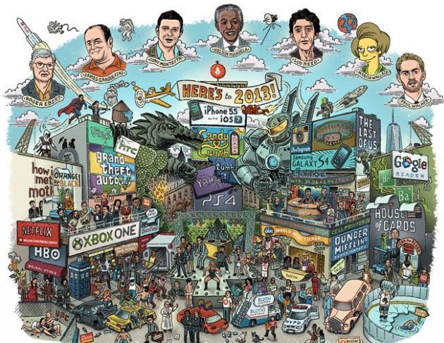 Η εικονογράφηση έχει γίνει από τον Mario Zucca, περιλαμβάνοντας περίπου 90 διαφορετικά θέματα τα οποία “στιγμάτισαν” τη χρονιά που τελειώνει. Ανάμεσά τους, φυσικά, το λανσάρισμα του Xbox One και του PS4, το iPhone 5S με το iOS 7, το Candy Crush Saga, προσωπικότητες που έφυγαν όπως ο Nelson Mandela ή ο Πολ Γουόκερ και άλλες πολλές μοναδικές αφορμές για να κάνετε τη δική σας αναδρομή στο 2013.