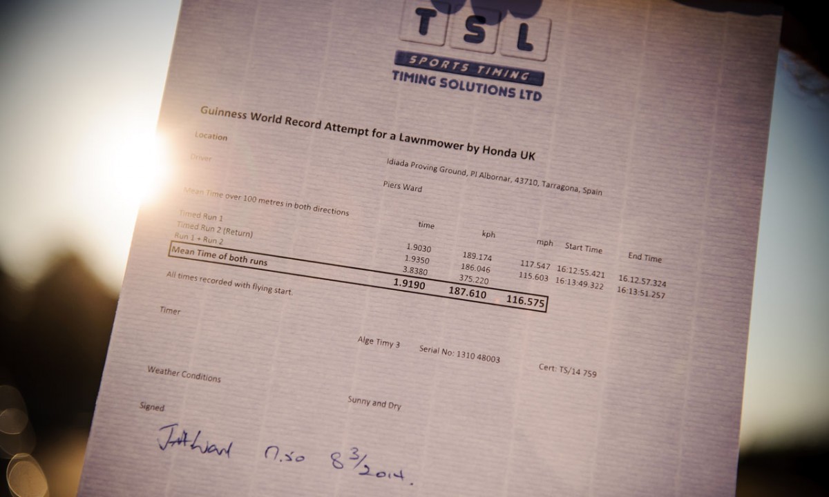 Τελικά, όλα πήγαν όπως τα είχαν προγραμματίσει οι άνθρωποι της Honda Βρετανίας και πλέον έχουν το ρεκόρ στο βιβλίο Guinness για την ταχύτερη μηχανή κουρέματος του γκαζόν στον κόσμο.
