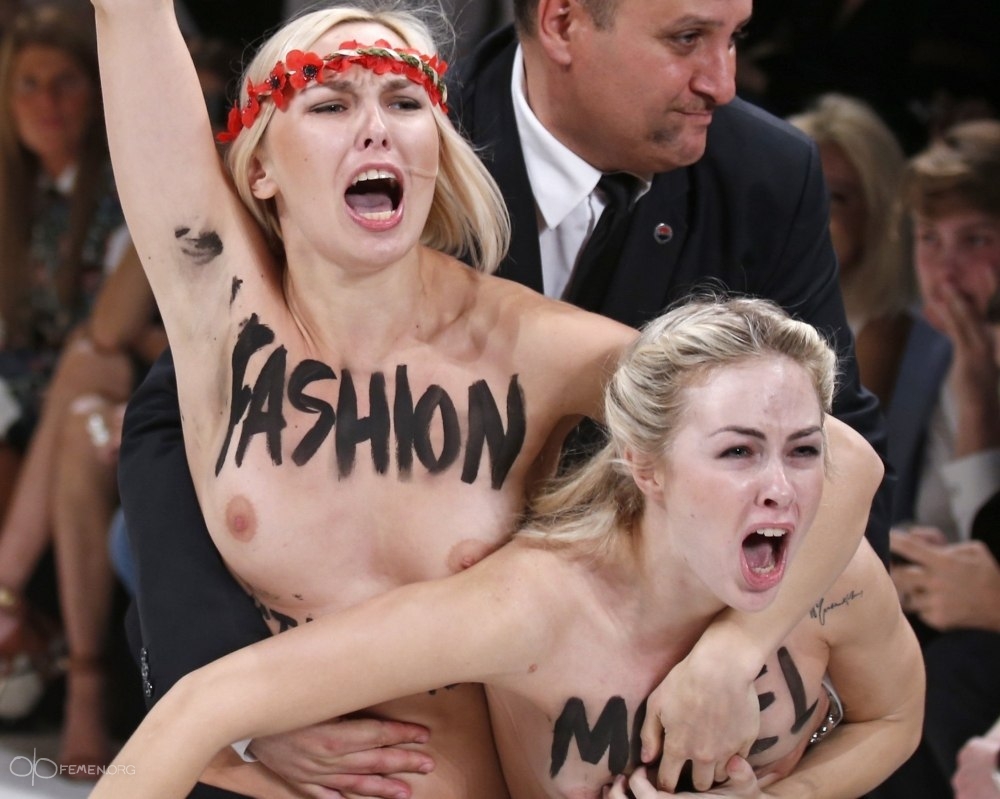 Οι νέες φεμινίστριες Femen που αρέσκονται να κυκλοφορούν γυμνόστηθες και να προκαλούν με τις εμφανίσεις του ανέβηκαν στην πασαρέλα ενώ το γυμνό τους σώμα είχαν γράψει με μαύρη μπογιά «μοντέλα πηγαίνετε στην κόλαση».