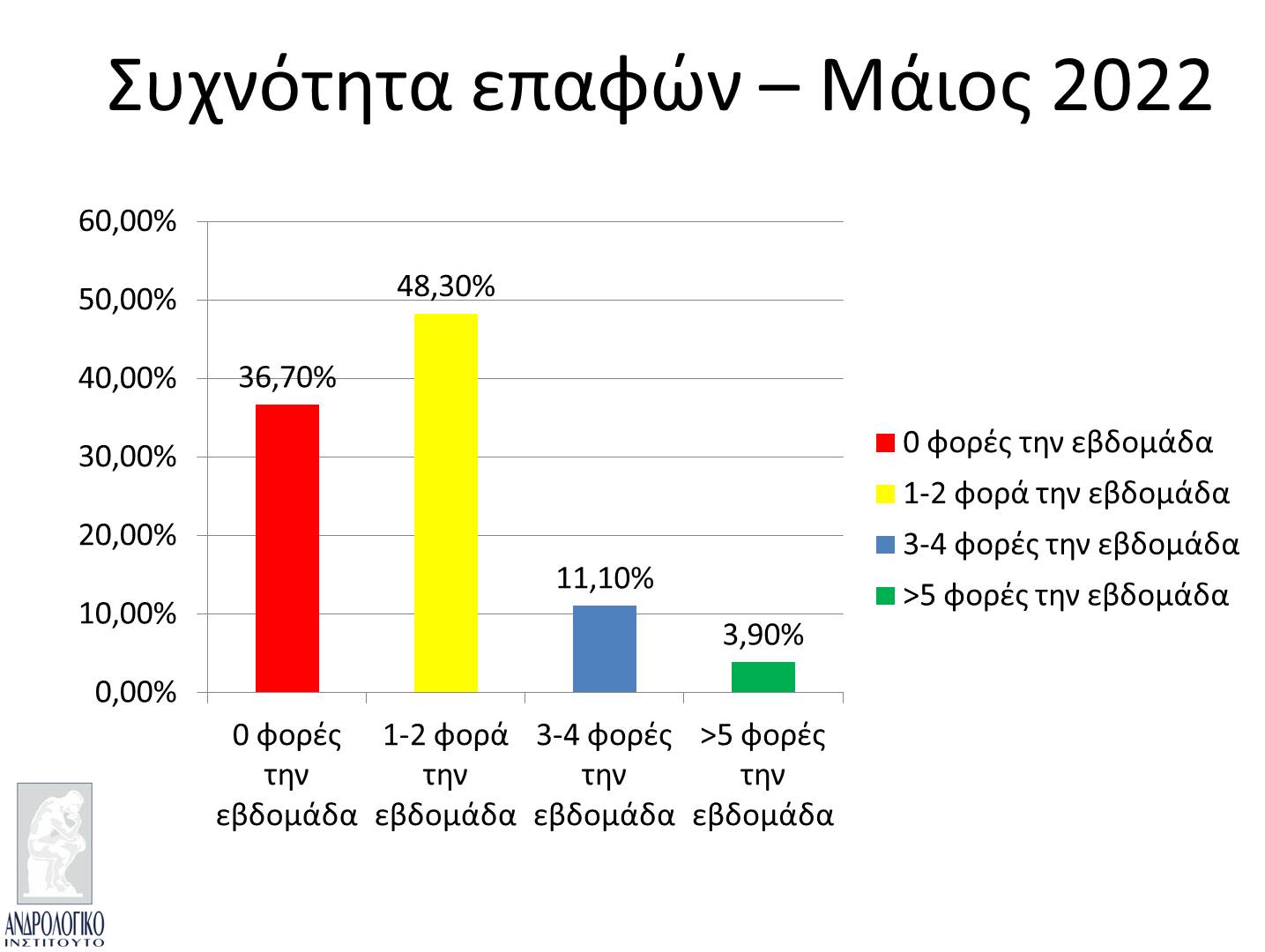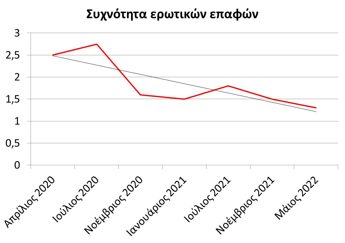 Τα παραπάνω ήρθαν να δώσουν το τελειωτικό χτύπημα στην ήδη ταλαιπωρημένη ψυχολογία των Ελλήνων και φυσικά και στην ερωτική τους ζωή, με τη σεξουαλική συχνότητα να βυθίζεται στις 1,3 επαφές την εβδομάδα και ένα μεγάλο ποσοστό των ερωτηθέντων (36,7%) να δηλώνει ότι απείχε πλήρως από τη σεξουαλική δραστηριότητα τον τελευταίο μήνα (δείγμα 2.000 ατόμων, ηλικίας 18 – 64 ετών από ολόκληρη την Ελλάδα με ισόποση εκπροσώπηση των φύλων, Μάιος 2022).