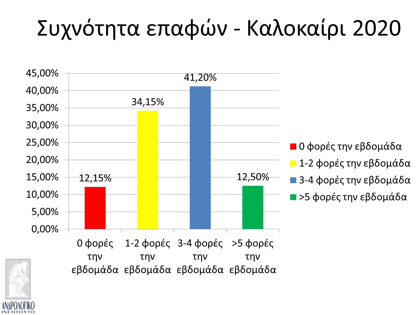 Χαρακτηριστικά αποτυπώνεται αυτό στα αποτελέσματα της έρευνας, σύμφωνα με την οποία ήρθαν τα πάνω κάτω στο σεξ, ανάλογα με την ένταση της πανδημίας: Το καλοκαίρι του 2020 η σεξουαλική συχνότητα άγγιξε τις 3 φορές την εβδομάδα, κυρίως στους νέους, που, ασφυκτιώντας στους αυστηρούς περιορισμούς, εκμεταλλεύτηκαν τη χαλάρωση των μέτρων για να αποδώσουν στον έρωτα την φυσική του θέση. Την συγκεκριμένη περίοδο το 53,7% των ερωτηθέντων απάντησε πως έκανε σεξ 3 ή περισσότερες φορές την εβδομάδα.