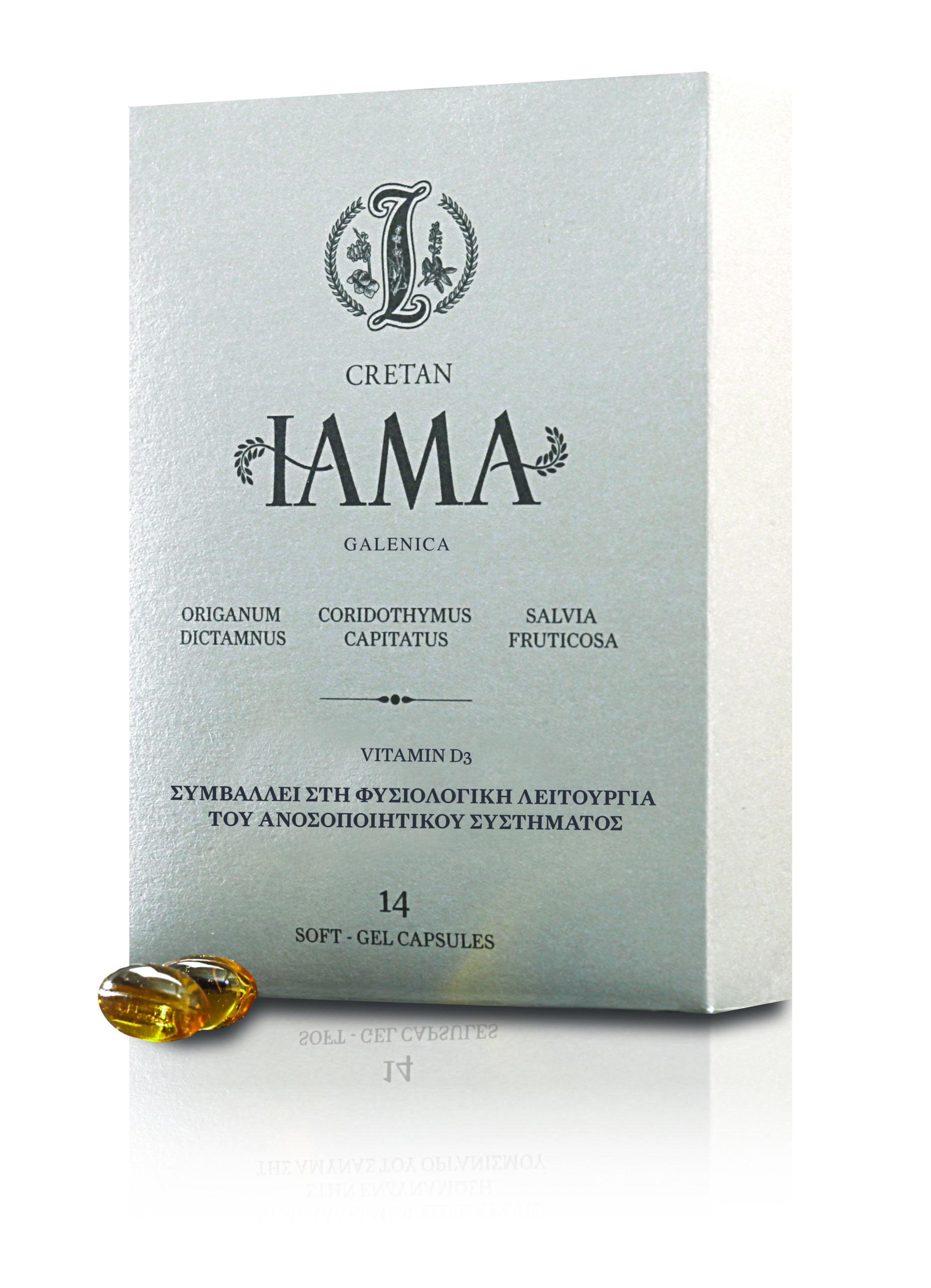 Με έναν πατενταρισμένο συνδυασμό αιθέριων ελαίων από τρία αρωματικά κρητικά βότανα– δίκταμο (Originarum dictamnus), θυμάρι (Coridothymus capitatus) και φασκόμηλο (Salvia fruticosa)- μέσα σε extra παρθένο ελαιόλαδο και σε συγκεκριμένες αναλογίες που λειτουργούν όχι απλά αθροιστικά αλλά συνεργιστικά και ολιστικά, το CRETAN ΙΑΜΑ γίνεται πολύτιμος «σύμμαχος» για τον καθένα που ταλαιπωρείται από ιώσεις και ειδικά τους χειμερινούς μήνες που αυτές βρίσκονται σε μεγαλύτερη έξαρση. Η δράση της καθεμίας ουσίας που περιέχει, ενισχύει ή/και συμπληρώνει τη δράση της άλλης, μαζί με βιταμίνη D3.