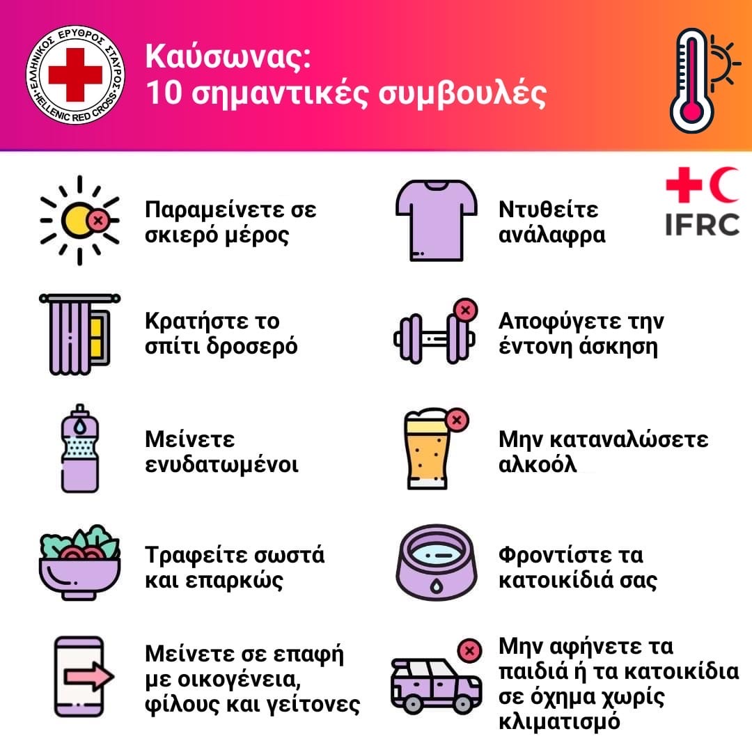 Με τον υδράργυρο να χτυπάει κόκκινο αυτές τις μέρες και το κύμα καύσωνα να είναι αισθητό σε όλες τις περιοχές της Ελλάδας, ο Ελληνικός Ερυθρός Σταυρός (ΕΕΣ), προτείνει 10 απλές οδηγίες για προστασία από τις υψηλές θερμοκρασίες, οι οποίες μπορούν να προκαλέσουν σοβαρά προβλήματα υγείας, ιδιαίτερα σε ομάδες υψηλού κινδύνου όπως ηλικιωμένοι και παιδιά.