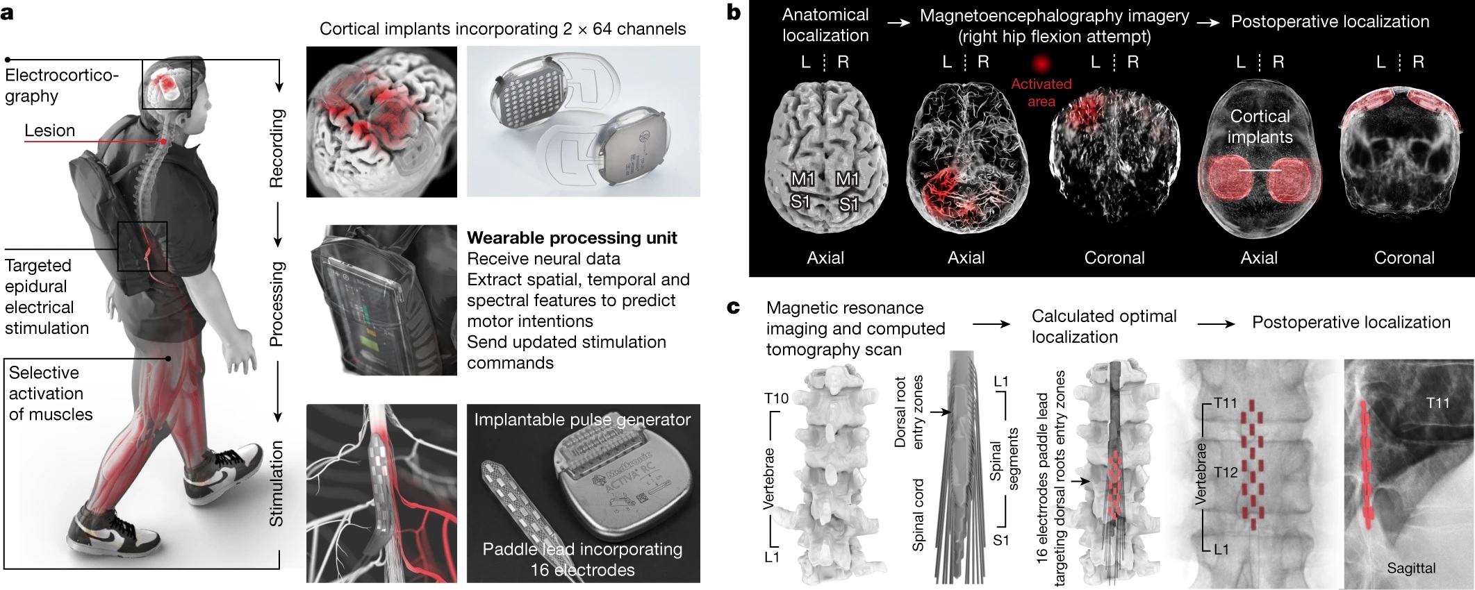 Ο νευροεπιστήμονας Γκρεγκουάρ Κουρτίν και οι συνεργάτες του δοκίμασαν μια διεπαφή εγκεφάλου- σπονδυλικής στήλης (BSI), η οποία αποτελείται από ένα εμφυτευμένο σύστημα καταγραφής και διέγερσης που δημιουργεί μια άμεση σύνδεση μεταξύ του εγκεφάλου και των περιοχών του νωτιαίου μυελού, οι οποίες εμπλέκονται στο περπάτημα. Το BSI μπόρεσε να βαθμονομηθεί μέσα σε λίγα λεπτά και παρέμεινε αξιόπιστο και σταθερό για πάνω από ένα χρόνο, ακόμη και στο σπίτι χωρίς επίβλεψη.