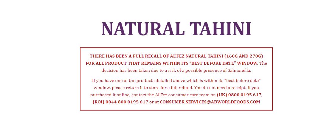 Η ανάκληση για το ταχίνι Al’Fez Natural Tahini έγινε οικειοθελώς από την AB World Foods. «Έγινε πλήρης ανάκληση για το φυσικό ταχίνι al’fez (160g και 270g) για όλα τα προϊόντα που παραμένουν εντός του παράθυρου “καλύτερης ημερομηνίας”. Η απόφαση ελήφθη λόγω του κινδύνου πιθανής παρουσίας σαλμονέλας», αναφέρει η ανακοίνωση της εταιρείας.