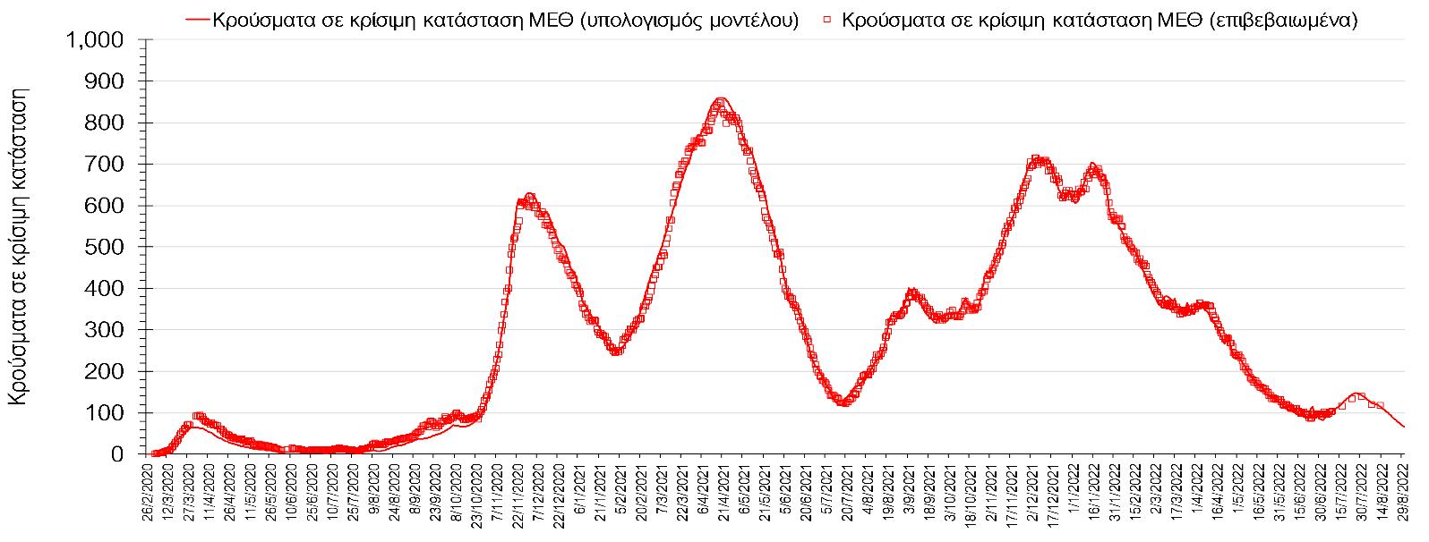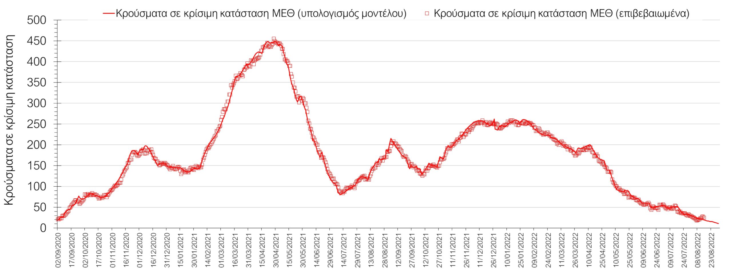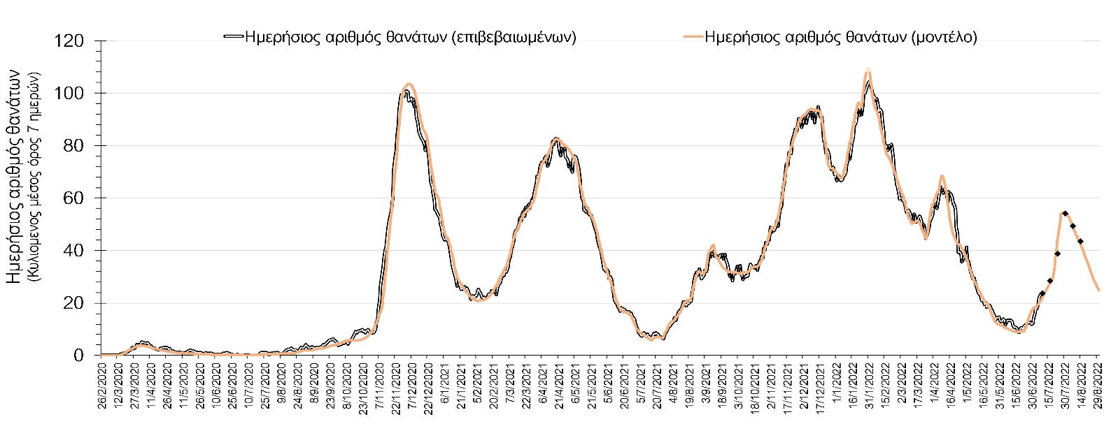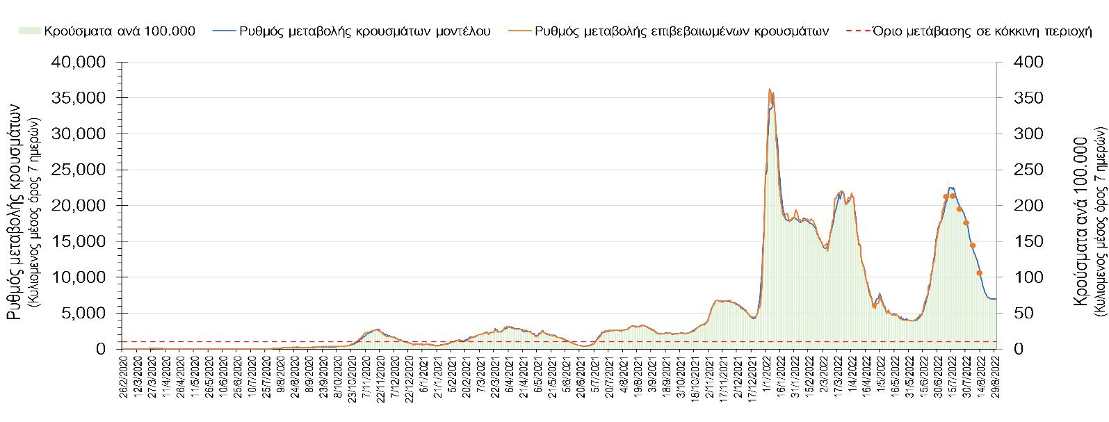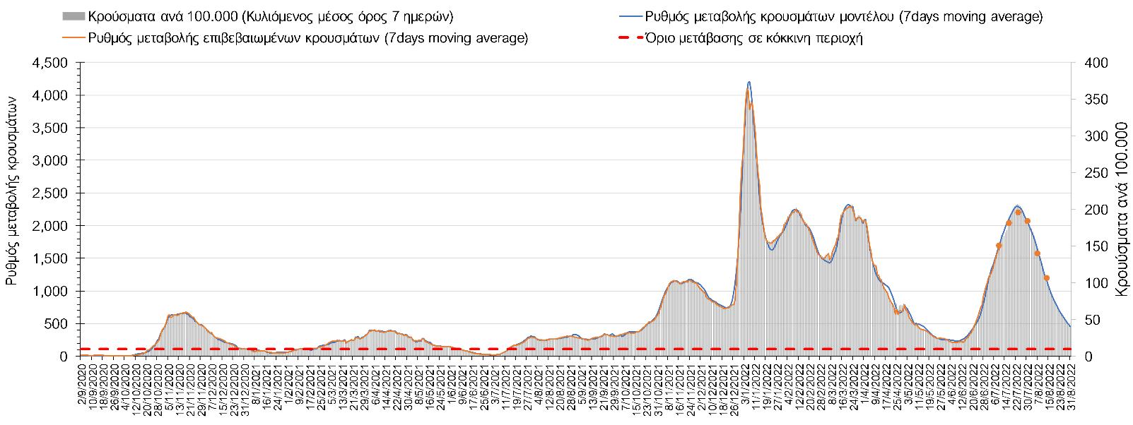 Η πορεία της μέσης εβδομαδιαίας τιμής των κρουσμάτων, καθώς και του κυλιόμενου μέσου όρου 7 ημερών του αριθμού των κρουσμάτων ανά 100.000 πληθυσμού, όπως έχουν καταγραφεί από τον ΕΟΔΥ και η αναμενόμενη πορεία τους, όπως προδιαγράφεται από την υπολογιστική πλατφόρμα CORE για την Ελληνική επικράτεια (όπως και στην Αττική και τη Θεσσαλονίκη) μέχρι τις 31 Αυγούστου, αποτυπώνονται στο Σχήμα 4 . Υπάρχει αυξημένος ρυθμός επαναμολύνσεων ακόμα και σε σύντομο διάστημα από προηγούμενη μόλυνση, που αποτελεί χαρακτηριστικό των νέων παραλλαγών της Ο (ΒΑ.4 και ΒΑ.5), το οποίο είναι ακόμη πιο μολυσματικό από την παραλλαγή Ο κατά 33% μεσοσταθμικά. Συνεπώς, ο συνδυασμός ολοκληρωτικής χαλάρωσης των μέτρων προστασίας και της παρουσίας των νέων στελεχών, οδήγησαν σε ένα νέο κύμα από την αρχή του Ιουνίου, το οποίο όμως εδώ και τέσσερις εβδομάδες βρίσκεται σε αποκλιμάκωση. H τελευταία οφείλεται σε ανάπτυξη φυσικής ανοσίας του πληθυσμού τοπικά λόγω μεγάλης διασποράς μέχρι τα μέσα Ιουλίου.