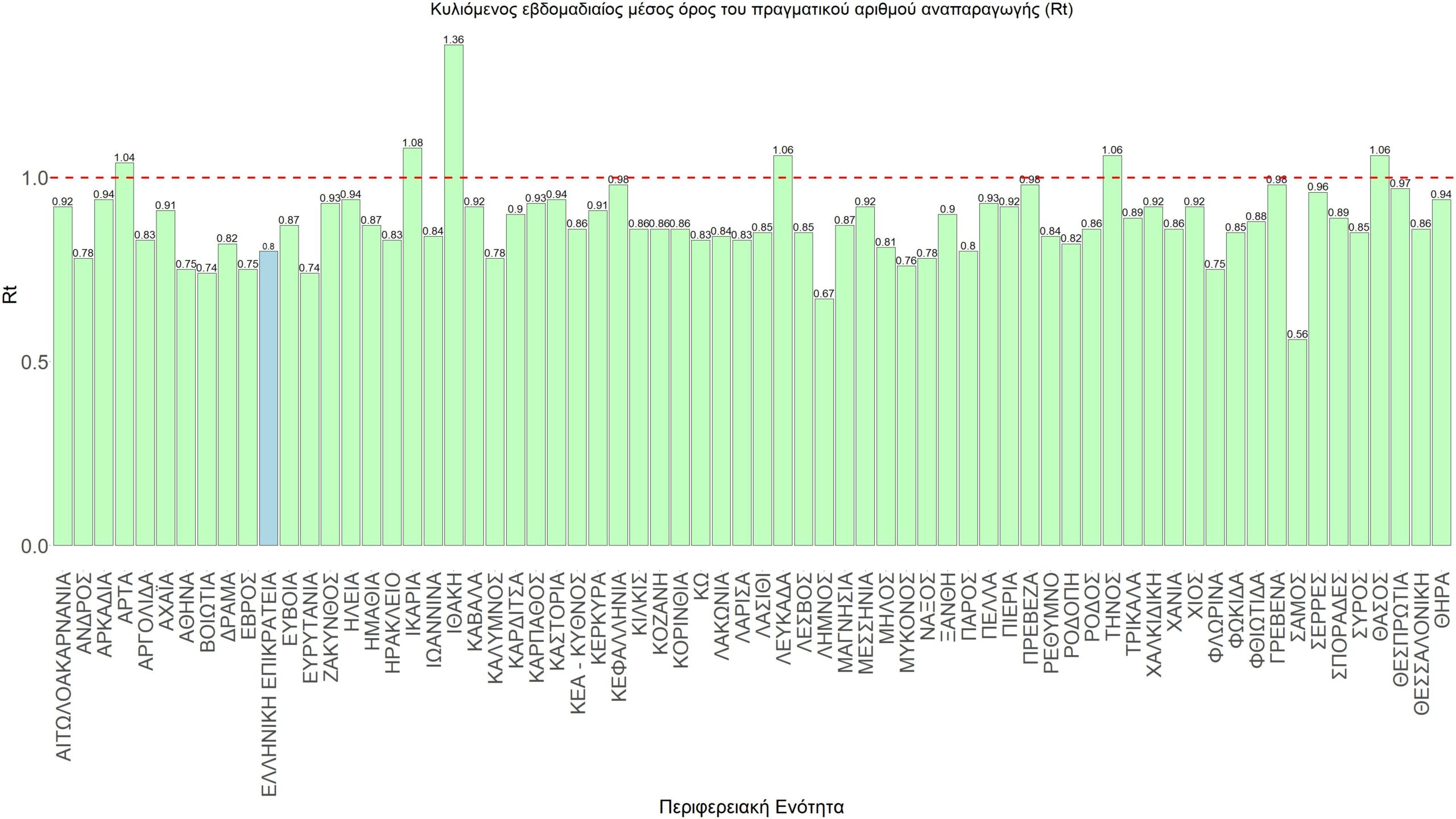 O πραγματικός αριθμός αναπαραγωγής Rt ανά περιφερειακή ενότητα της χώρας παρουσιάζεται στο Σχήμα 74 .