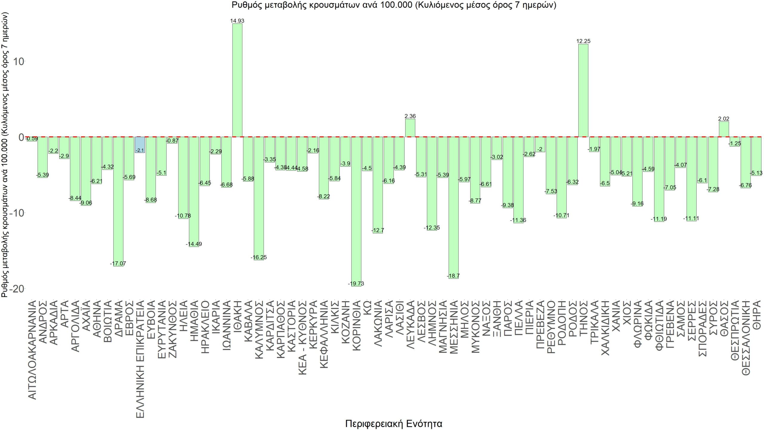 Η αποτύπωση των τάσεων στις επιμέρους περιοχές, παρουσιάζεται στο Σχήμα 77 , όπου παρουσιάζεται ο ρυθμός μεταβολής των νέων κρουσμάτων ανά 100.000 κατοίκους (κυλιόμενος μέσος όρος 7 ημερών) των επιμέρους περιοχών. Θετικές τιμές του ρυθμού μεταβολής υποδηλώνουν άνοδο, ενώ αρνητικές τιμές υποδηλώνουν πτωτική πορεία.