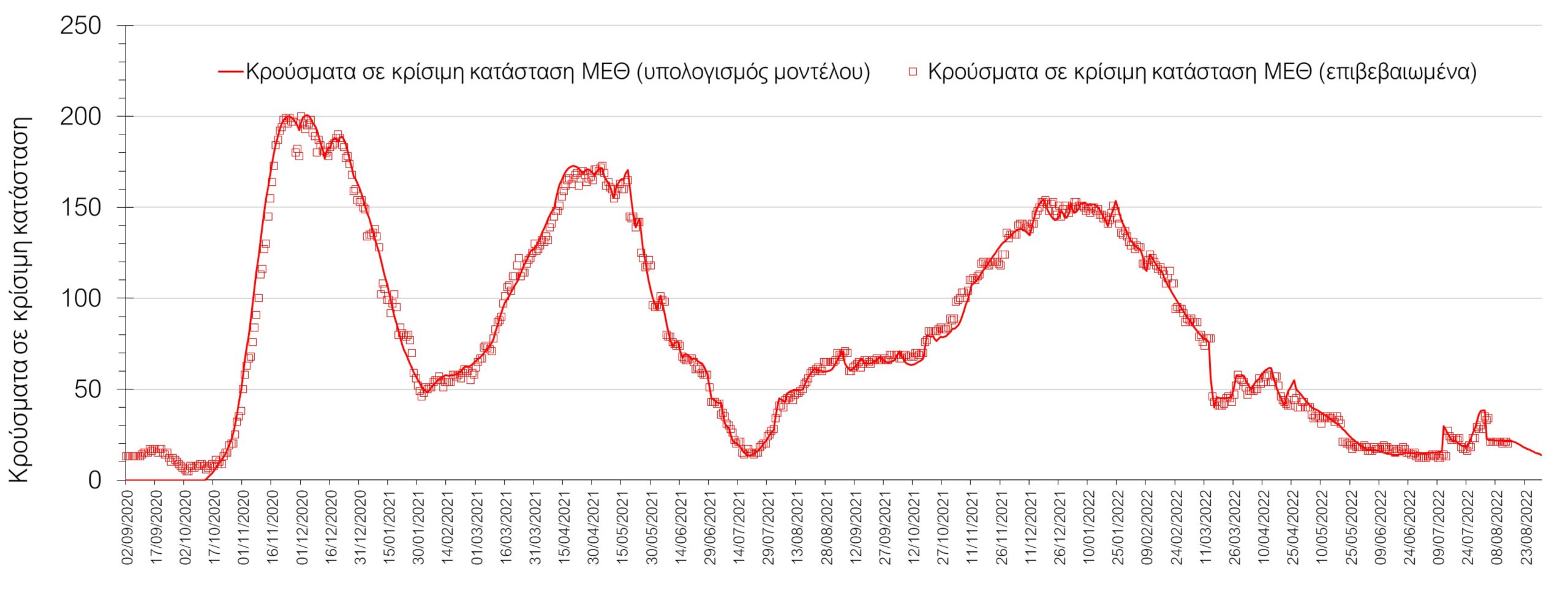 Σχήμα 1. Αριθμός κρουσμάτων σε κρίσιμη κατάσταση (ΜΕΘ) σύμφωνα με τα στοιχεία του ΕΟΔΥ και τις προβλέψεις της υπολογιστικής πλατφόρμας CORE.