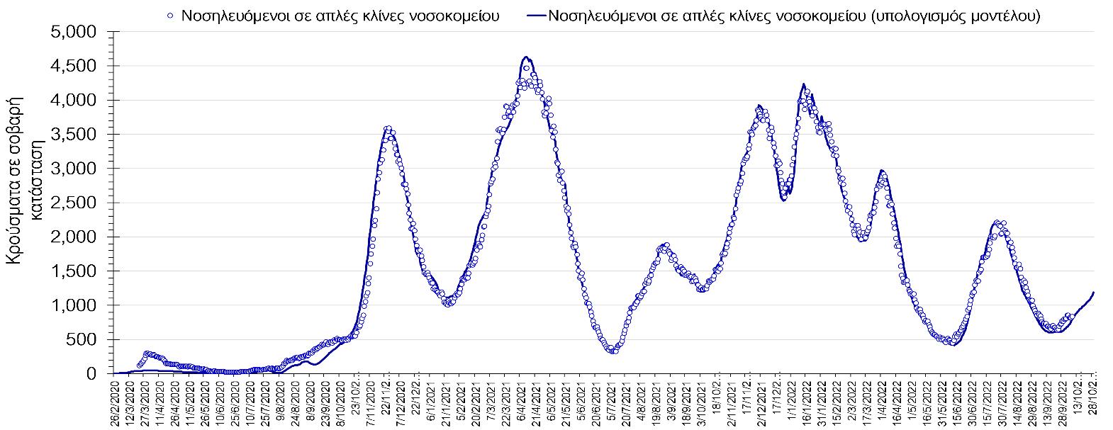 Σχήμα 2. Αριθμός κρουσμάτων σε σοβαρή κατάσταση (νοσηλευόμενοι σε απλές κλίνες) σύμφωνα με τα στοιχεία του ΕΟΔΥ και τις προβλέψεις της υπολογιστικής πλατφόρμας CORE.