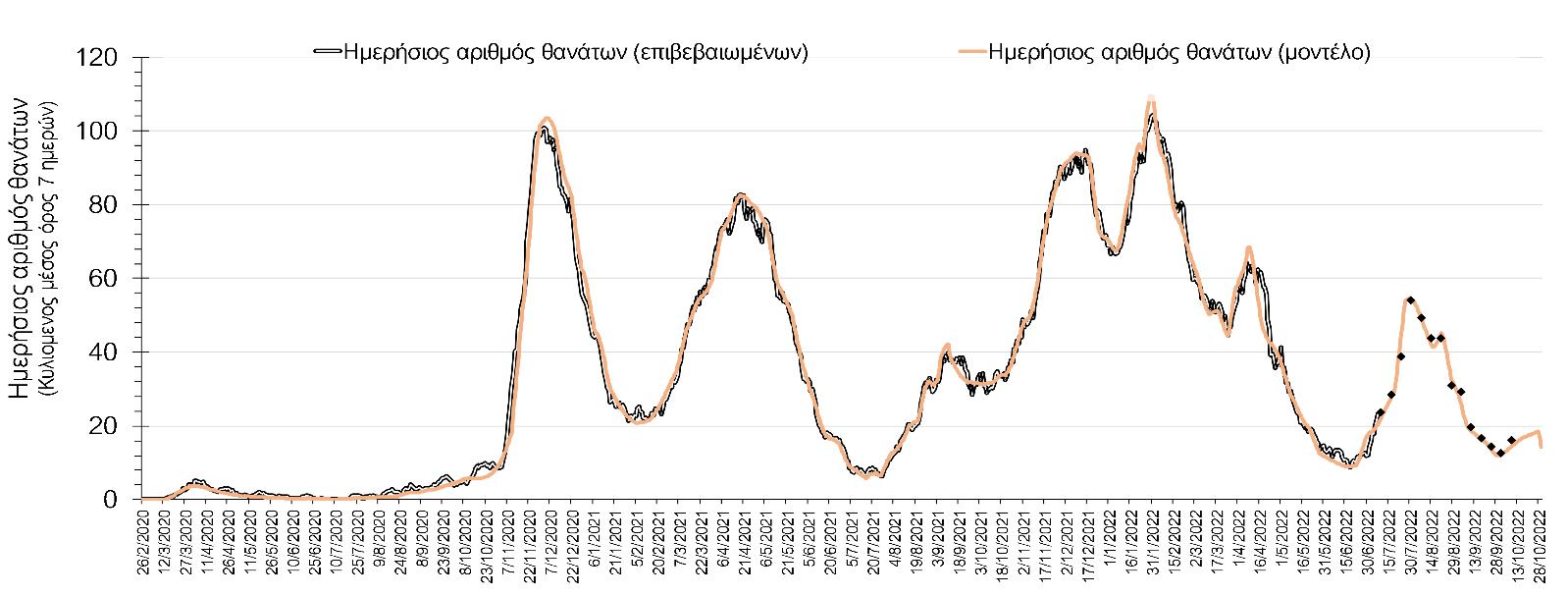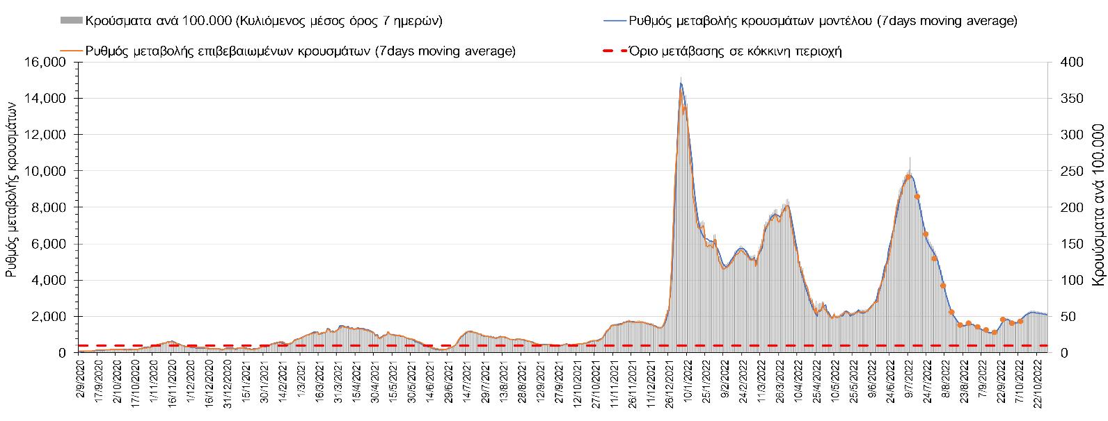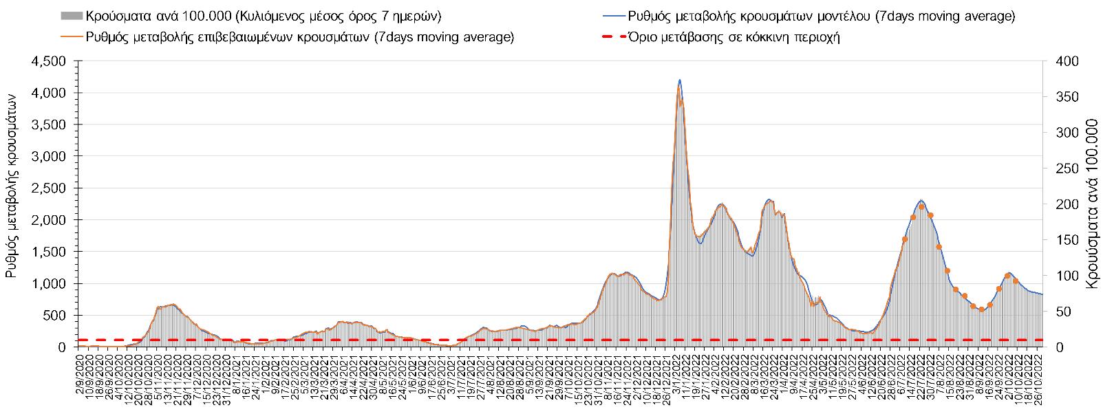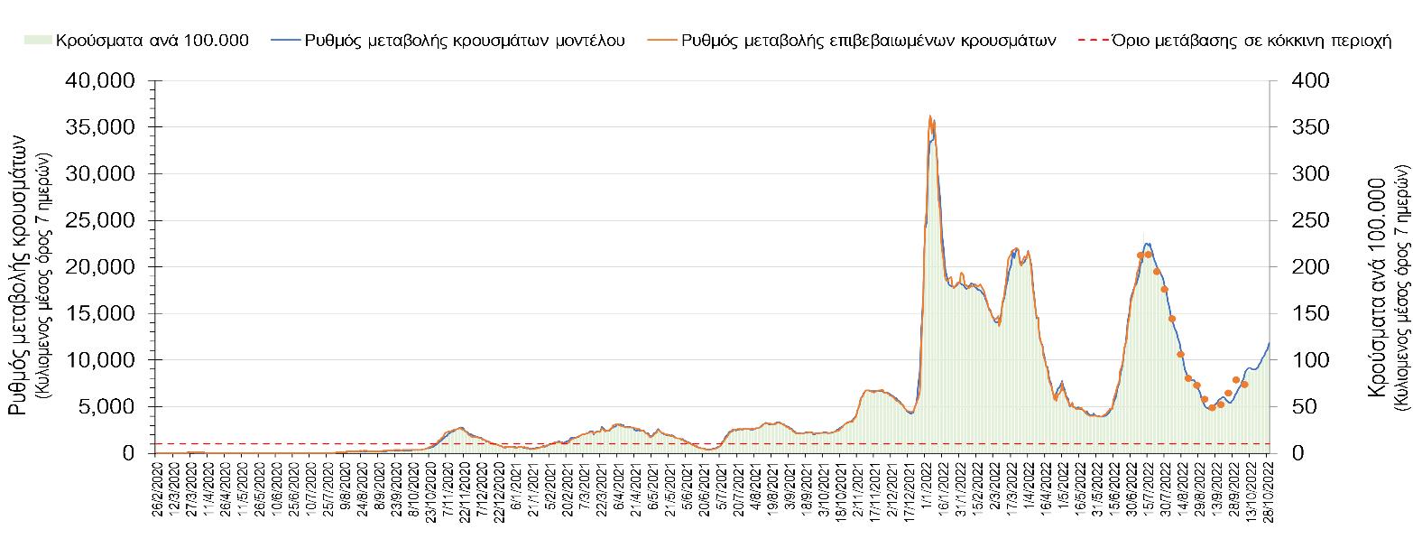 Η πορεία της μέσης εβδομαδιαίας τιμής των κρουσμάτων, καθώς και του κυλιόμενου μέσου όρου 7 ημερών του αριθμού των κρουσμάτων ανά 100.000 πληθυσμού, όπως έχουν καταγραφεί από τον ΕΟΔΥ και η αναμενόμενη πορεία τους, όπως προδιαγράφεται από την υπολογιστική πλατφόρμα CORE για την Ελληνική επικράτεια μέχρι τις 30 Οκτωβρίου, αποτυπώνονται στο Σχήμα 4. Υπάρχει αυξημένος ρυθμός επαναμολύνσεων ακόμα και σε σύντομο διάστημα από προηγούμενη μόλυνση, που αποτελεί χαρακτηριστικό των νέων παραλλαγών της Ο (ΒΑ.4 και ΒΑ.5), το οποίο είναι ακόμη πιο μολυσματικό από την παραλλαγή Ο κατά 33% μεσοσταθμικά.