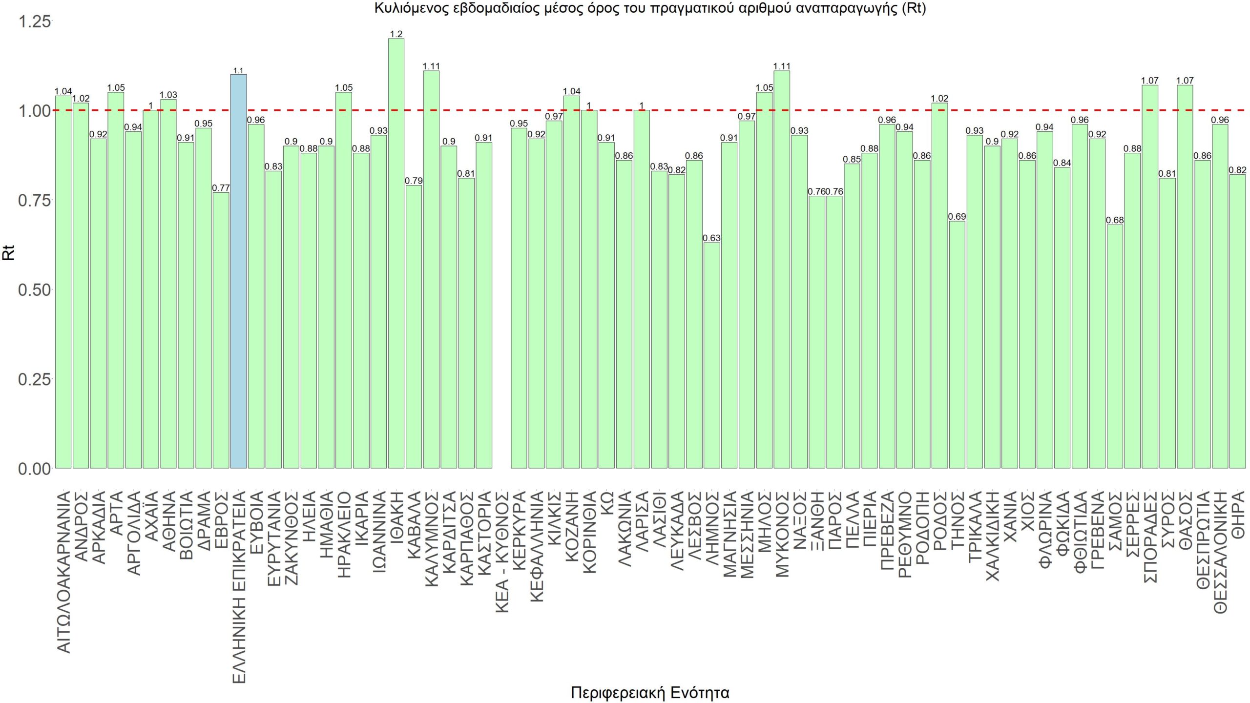O πραγματικός αριθμός αναπαραγωγής Rt ανά περιφερειακή ενότητα της χώρας παρουσιάζεται στο Σχήμα 74.
