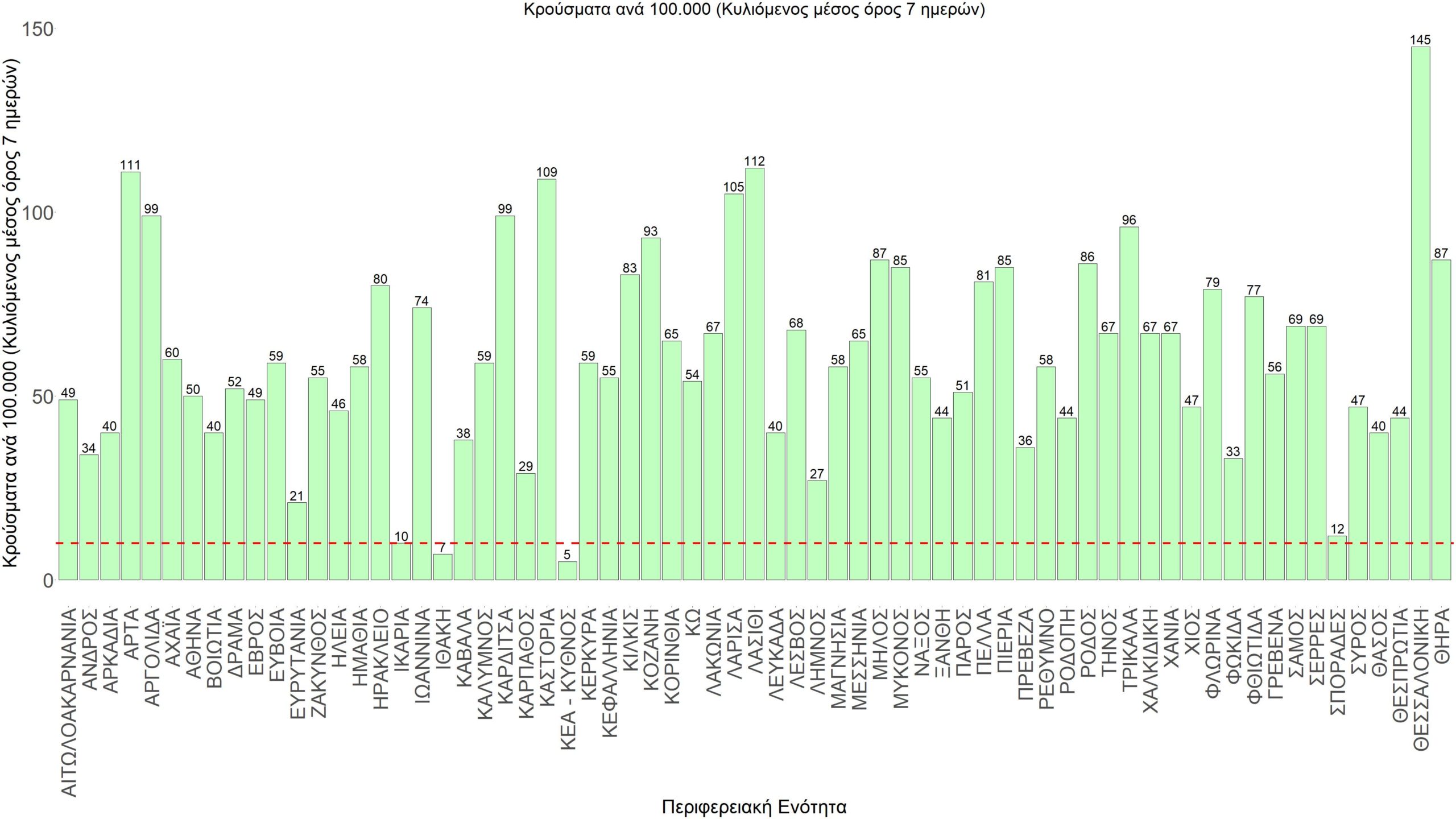 Η συγκεντρωτική εικόνα των νέων κρουσμάτων ανά 100.000 κατοίκους (κυλιόμενος μέσος όρος 7 ημερών) των επιμέρους περιοχών παρουσιάζεται στο Σχήμα 76. Όλες οι περιοχές παραμένουν πάνω από το όριο ανησυχίας με εξαίρεση την Κέα-Κύθνο και Ιθάκη.