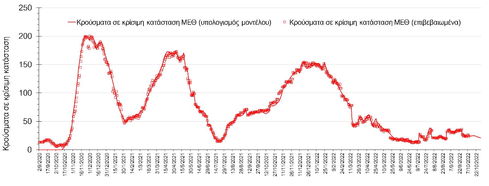 Σχήμα 1. Αριθμός κρουσμάτων σε κρίσιμη κατάσταση (ΜΕΘ) σύμφωνα με τα στοιχεία του ΕΟΔΥ και τις προβλέψεις της υπολογιστικής πλατφόρμας CORE.