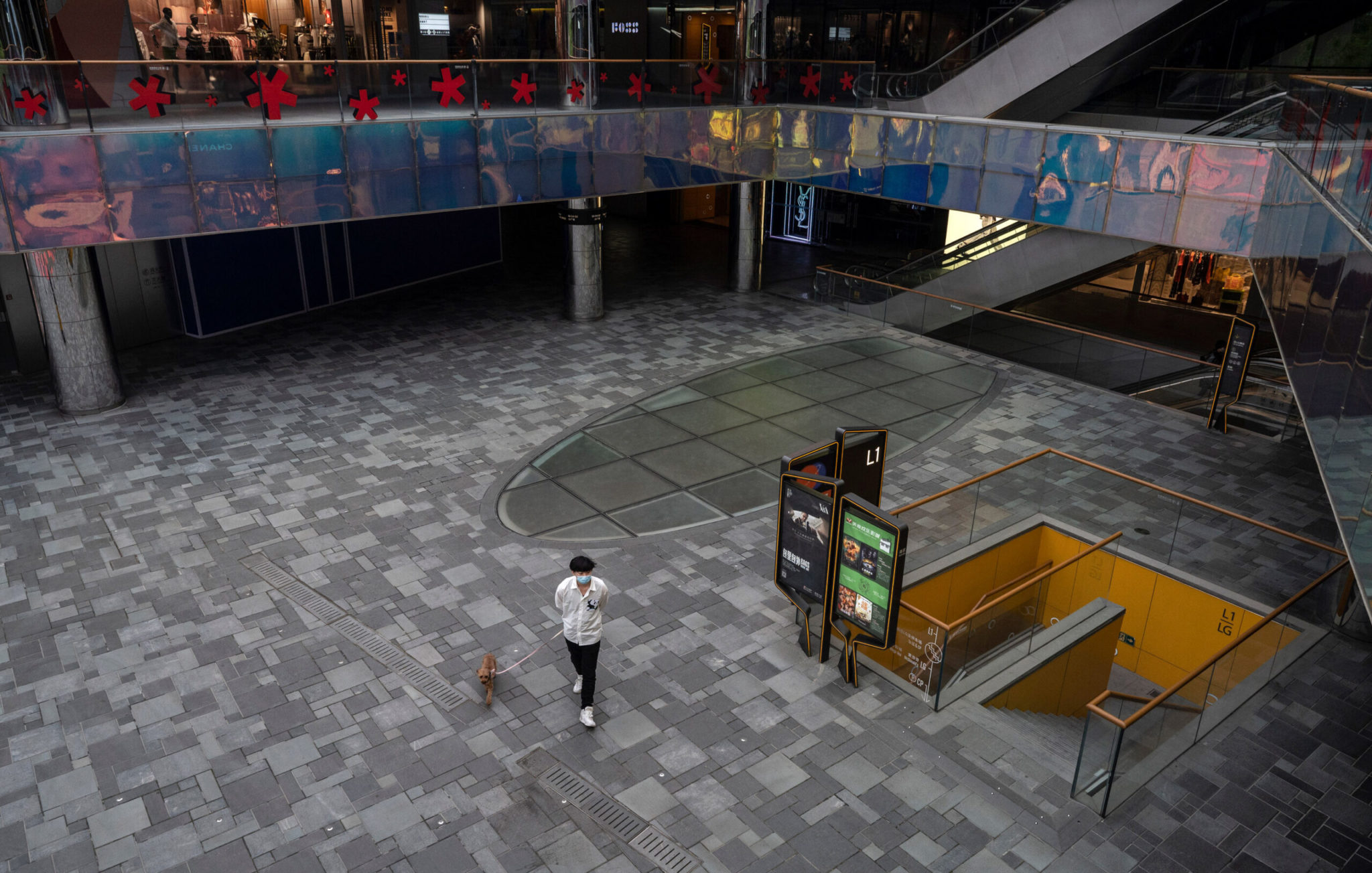 BEIJING, CHINA - MAY 10: A man walks his dog through the nearly empty courtyard of the usually bustling Taikoo Li mall in Sanlitun after many retail stores were closed to help prevent the spread of COVID-19 on May 10, 2022 in Beijing, China. China is trying to contain a spike in coronavirus cases in the capital Beijing after hundreds of people tested positive for the virus in recent weeks, causing local authorities to initiate mass testing in most districts, close schools and stores, ban gatherings and inside dining in all restaurants, and to lockdown some neighbourhoods in an effort to maintain the country's zero COVID strategy.(Photo by Kevin Frayer/Getty Images)